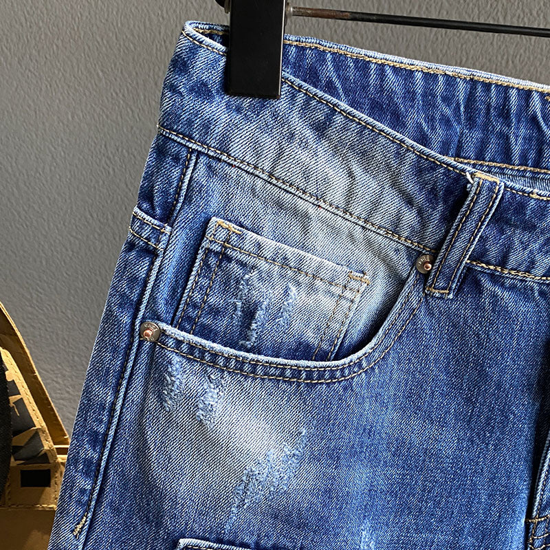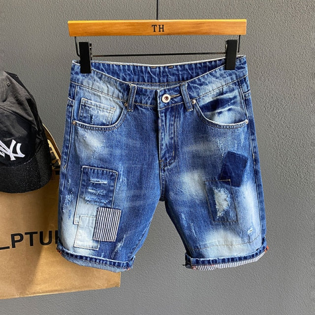 Men Vintage Blue Patchwork Distressed Denim Shorts